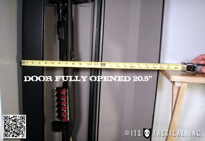 Since the door hinges are on the right corner, you’ll need to keep in mind the out-swing to the right. If you were to put this next to a dresser or other item you will need about 20 1/2” overall clearance, however this is with the door fully opened to the right (see photos). You certainly don’t need the door opened all the way to access the weapons and I would say 16 1/4” overall is the minimum space you would need.