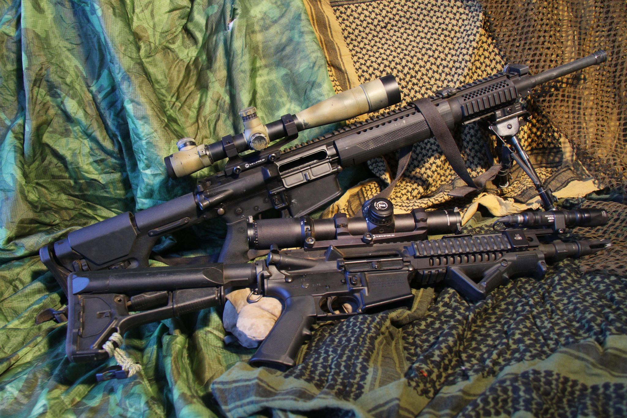 We decided on variable zoom scopes with front focal plane mil dot reticles for both our weapons to eliminate the need for binoculars or spotting scopes. Good optics are also very heavy, but with mil dot reticles in both our scopes, we can spot for each other without the additional gear.