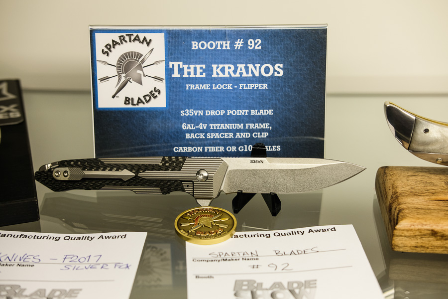 The Spartan Blades booth was full of new models, including the Hybris, a warncliff tactical fixed blade. Many variants of the award winning SHF (Spartan Harsey Folder, awarded “Blade Magazine American Knife of the Year 2016”) were on display, including damascus blade options.