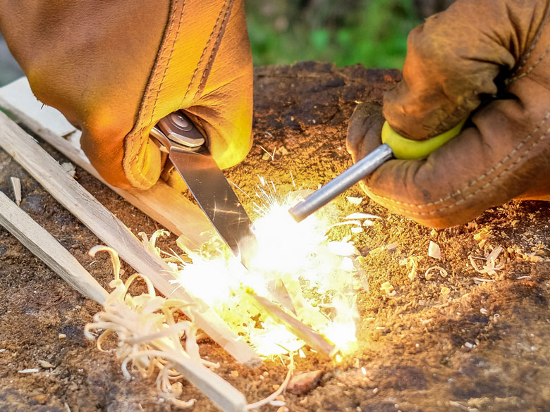 Now moving onto fire starting! Although the GM3’s spine is rounded, I’d describe it as progressively rounded towards the handle. Actually the front 1/3 has a sharp spine edge, which effectively throws sparks from a ferrocerium rod. That was a huge surprise for me! I don’t know if it was intentionally designed as such or not, but it works and this feature should be communicated by Giant Mouse.