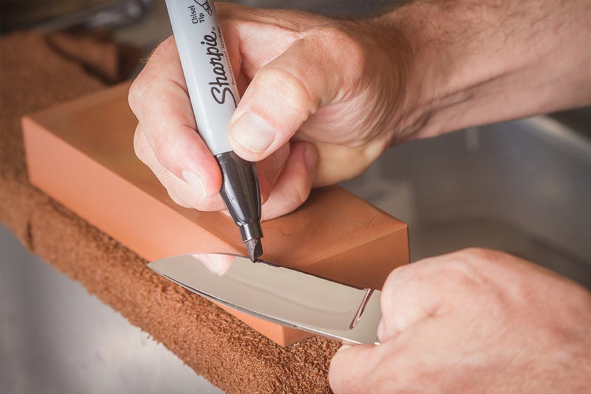 You will continue doing this back and forth motion, checking your angle frequently as you sharpen, until you’ve established an edge.